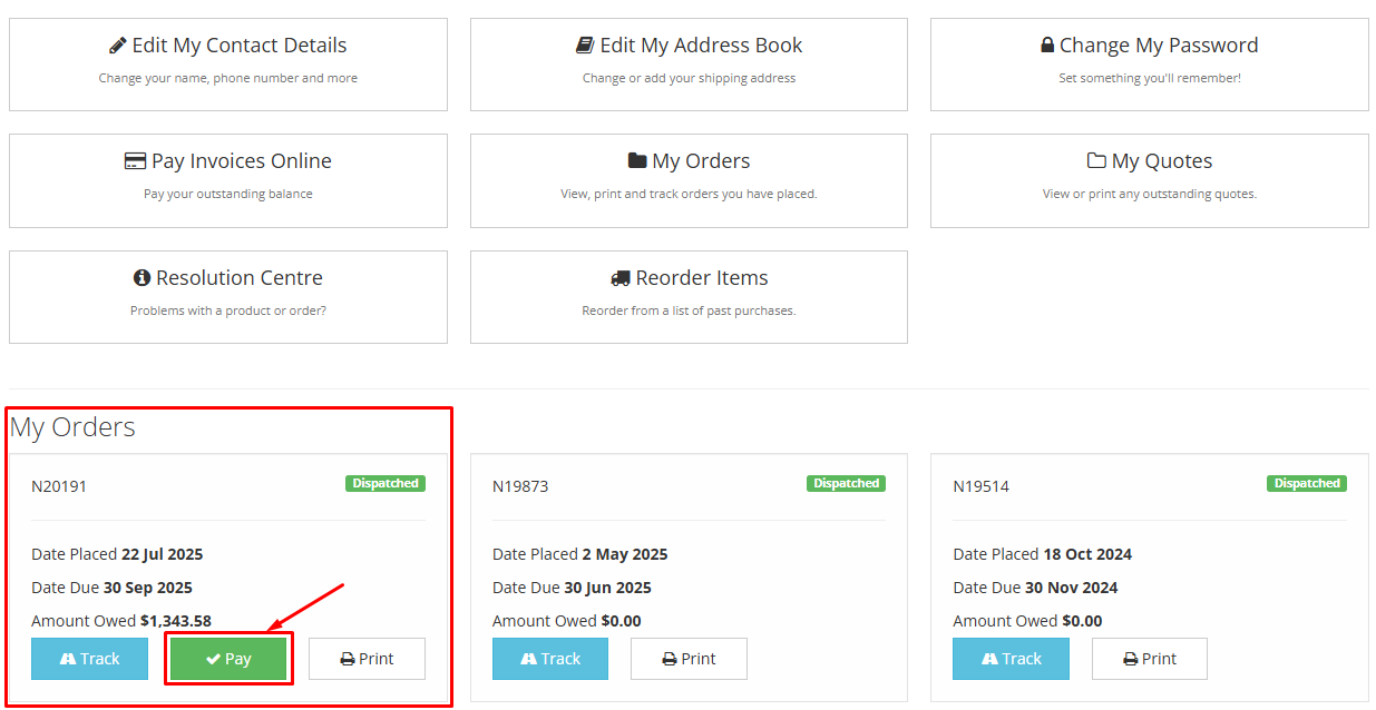 Go to My Orders. Identify the order you want to pay and click pay
