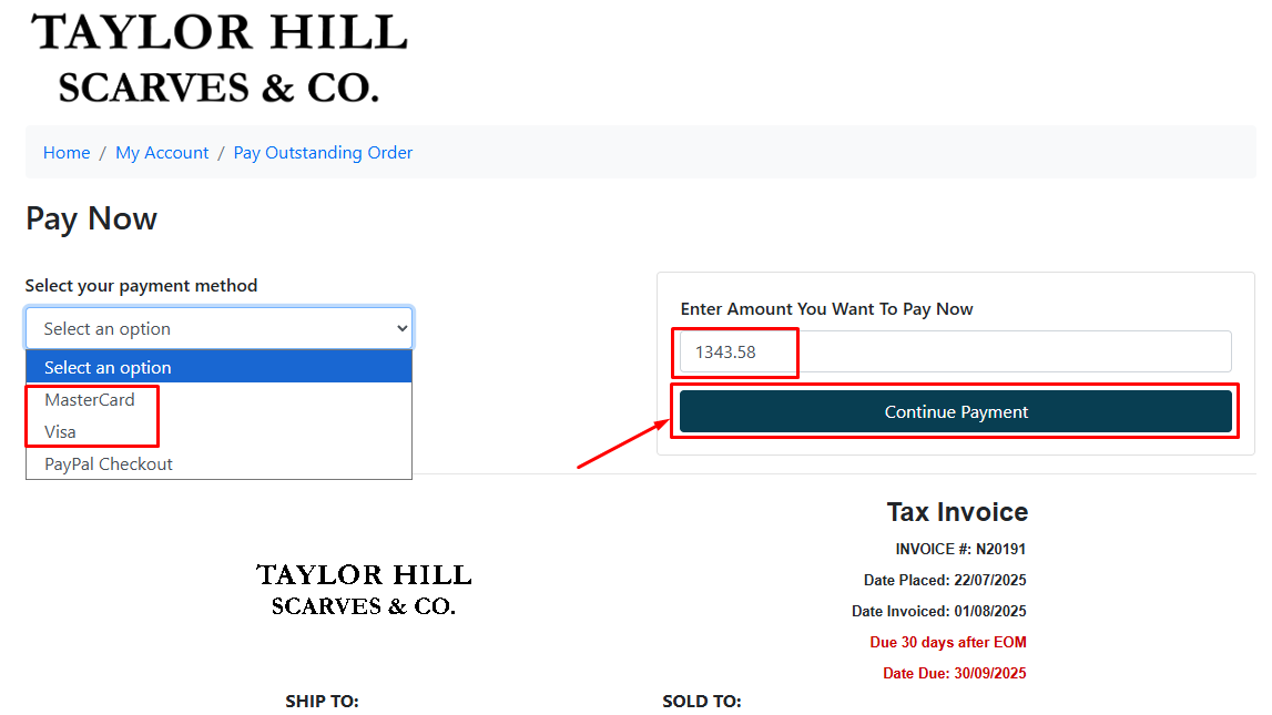 Log in to your account via our website. If you have problem with your login details please contact us by phone 0435 336 552 option 1 or email accounts@taylorhillscarves.com.au