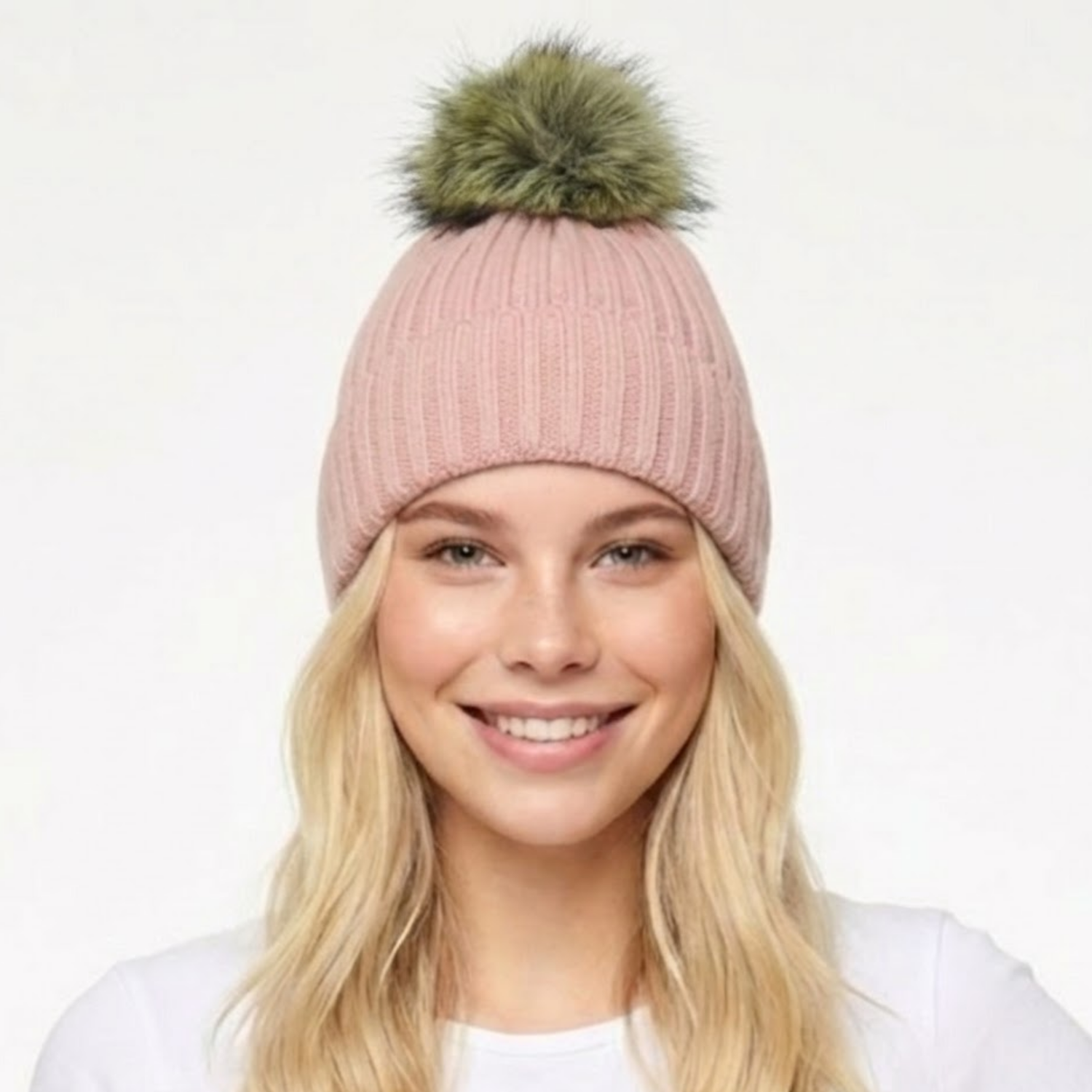 THSBE1037: Green:  Pom Pom Ribbed Knit Beanie