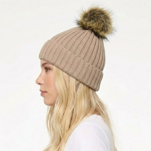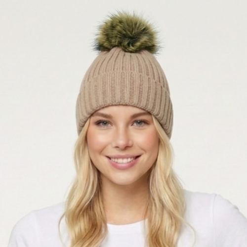 • THSBE1027: Taupe: Double Layer Pom Pom Rib Knit Beanie