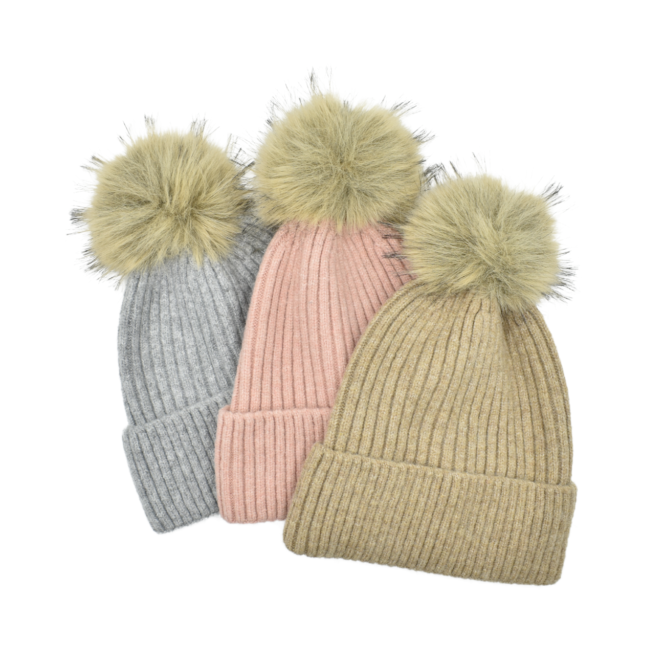 THSAP1385: (3 pcs) Double Layer Pom Pom Rib Knit Beanie Pack