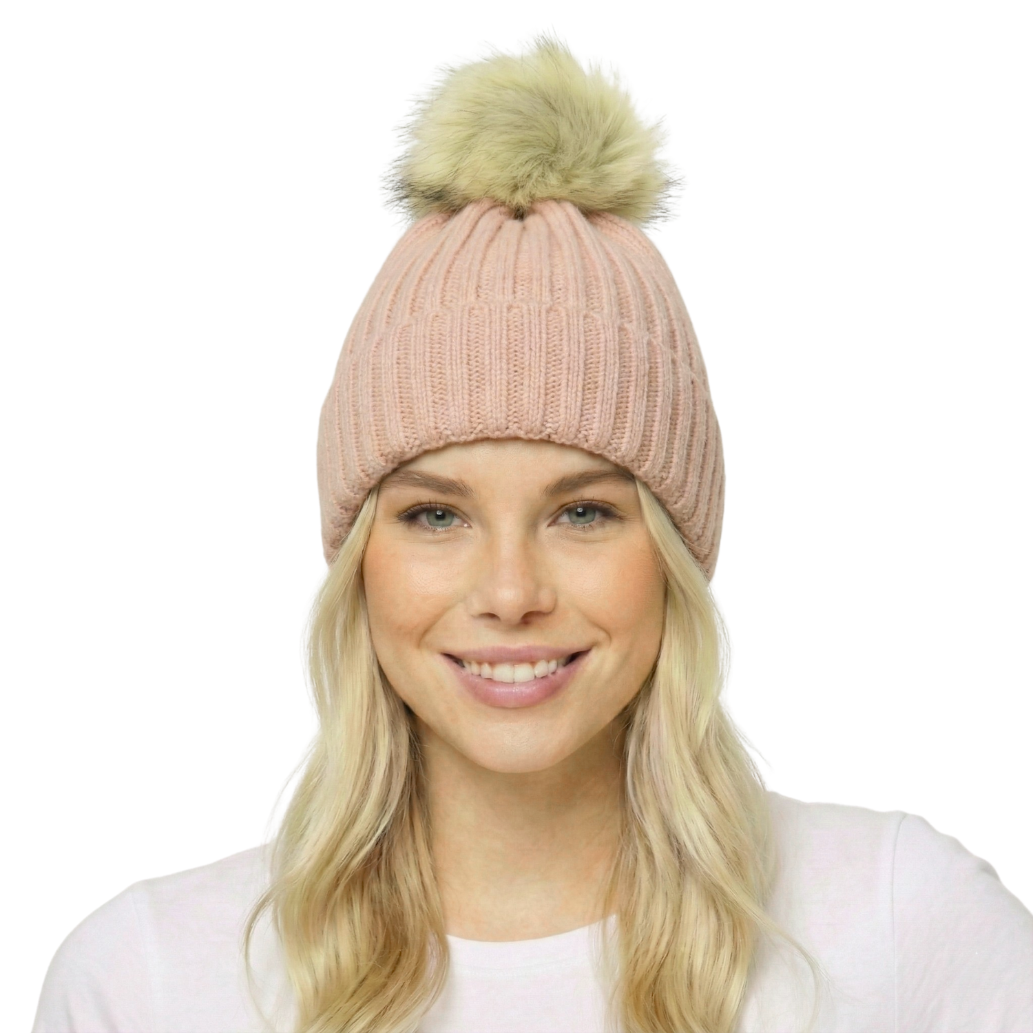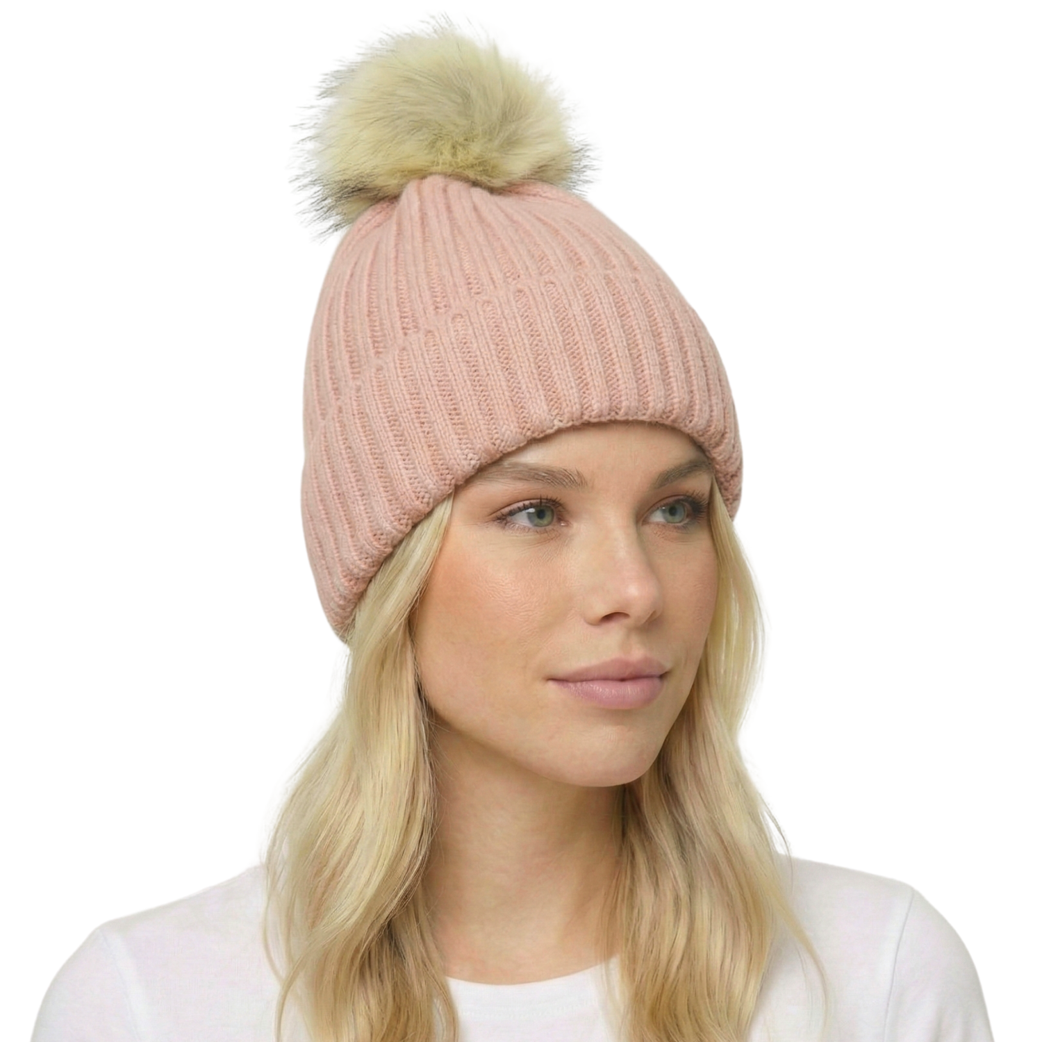 THSBE1039: Cream: Pom Pom Ribbed Knit Beanie