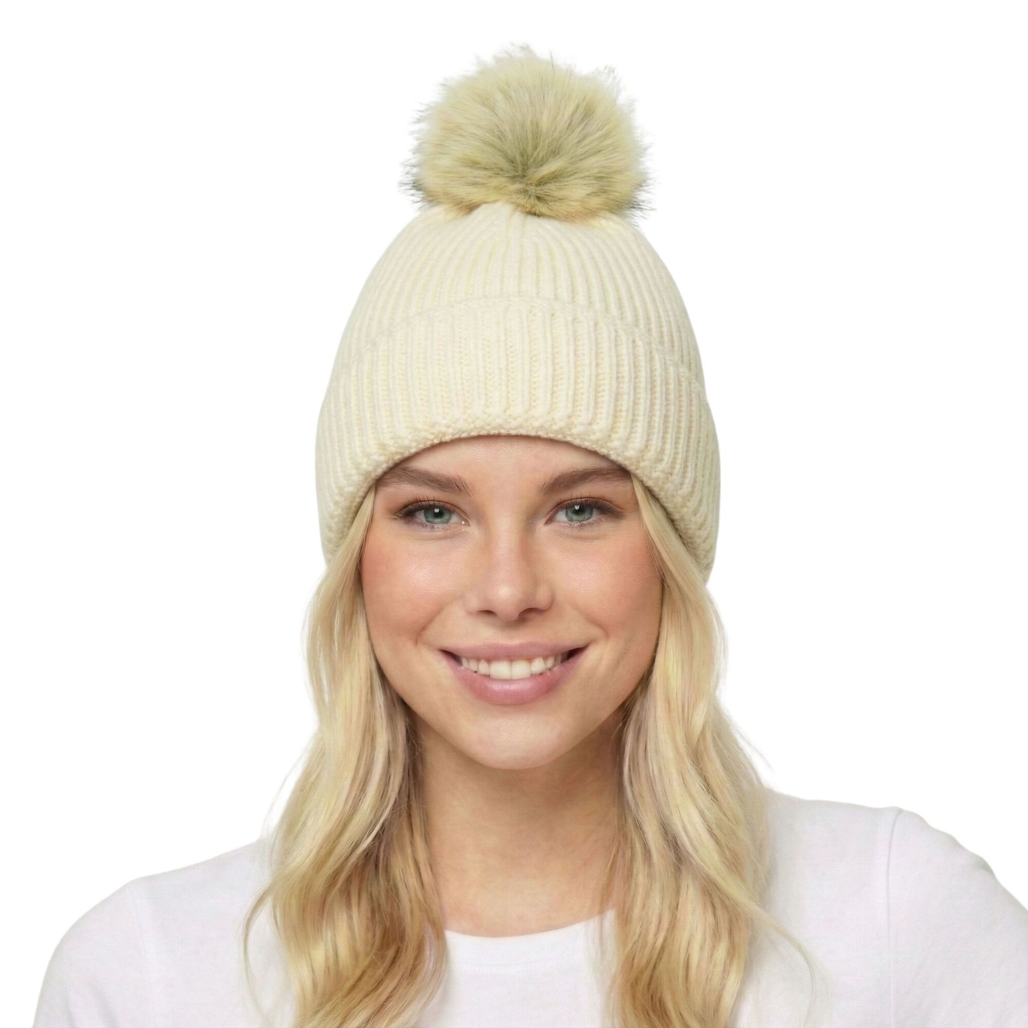 THSBE1039: Cream: Pom Pom Ribbed Knit Beanie