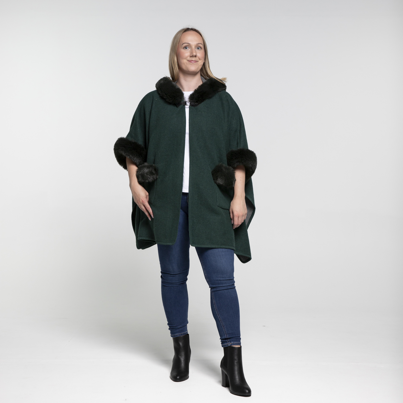 THSP1044: Green: Faux Fur Plain Sleeve Cape Coat